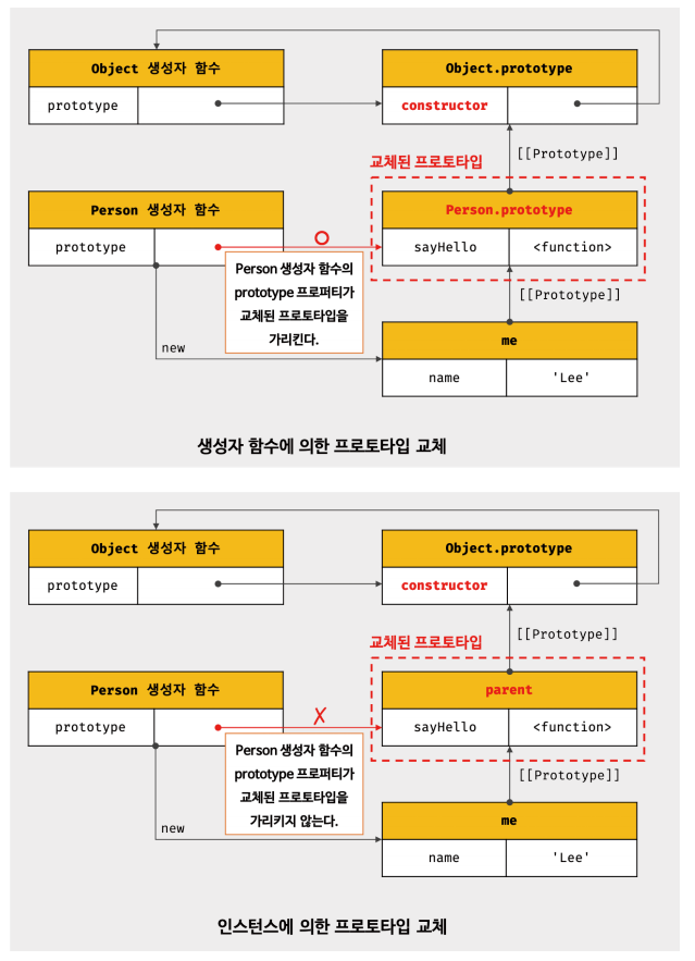 - __proto__ 접근자 프로퍼티를 통해 새로운 프로토타입을 할당하면 __proto__ 접근자 프로퍼티의 setter 함수인 [[Set]]이 호출된다.